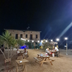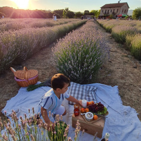 Farmhouse surrounded by nature with animals, vineyards, and family activities.